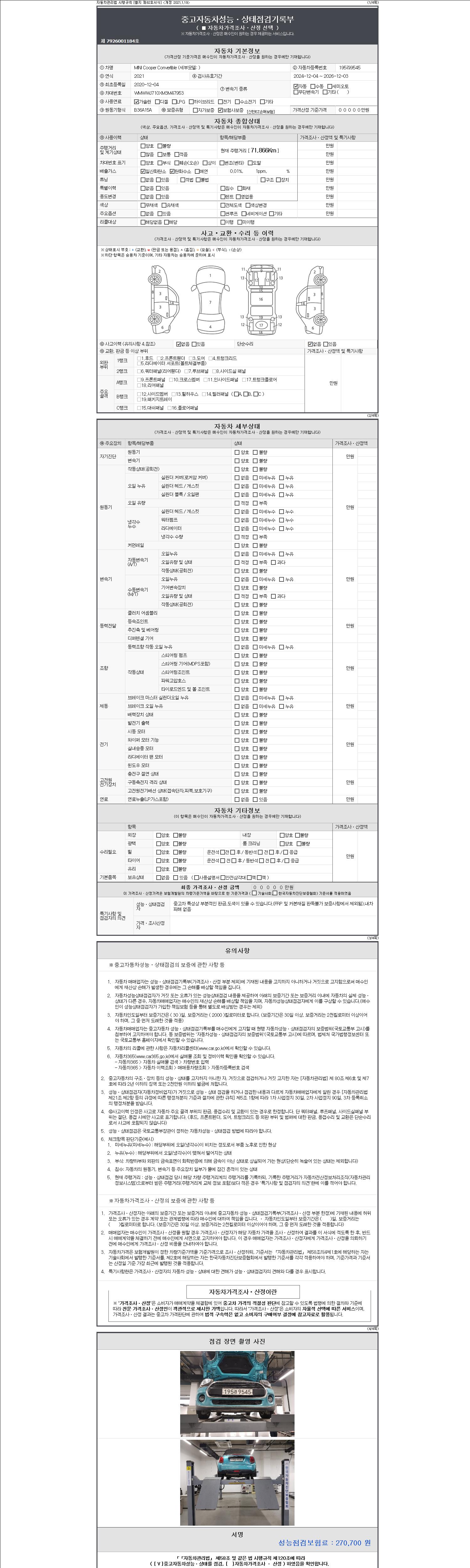 -중고자동차 매매업자를 통해 차량을 구입하실 경우 반드시 "중고자동차 성능, 상태점검 기록부"를 교뷰 받으셔야 하며, 매매업자는 반드시 의무 교부 하여야 압니다.