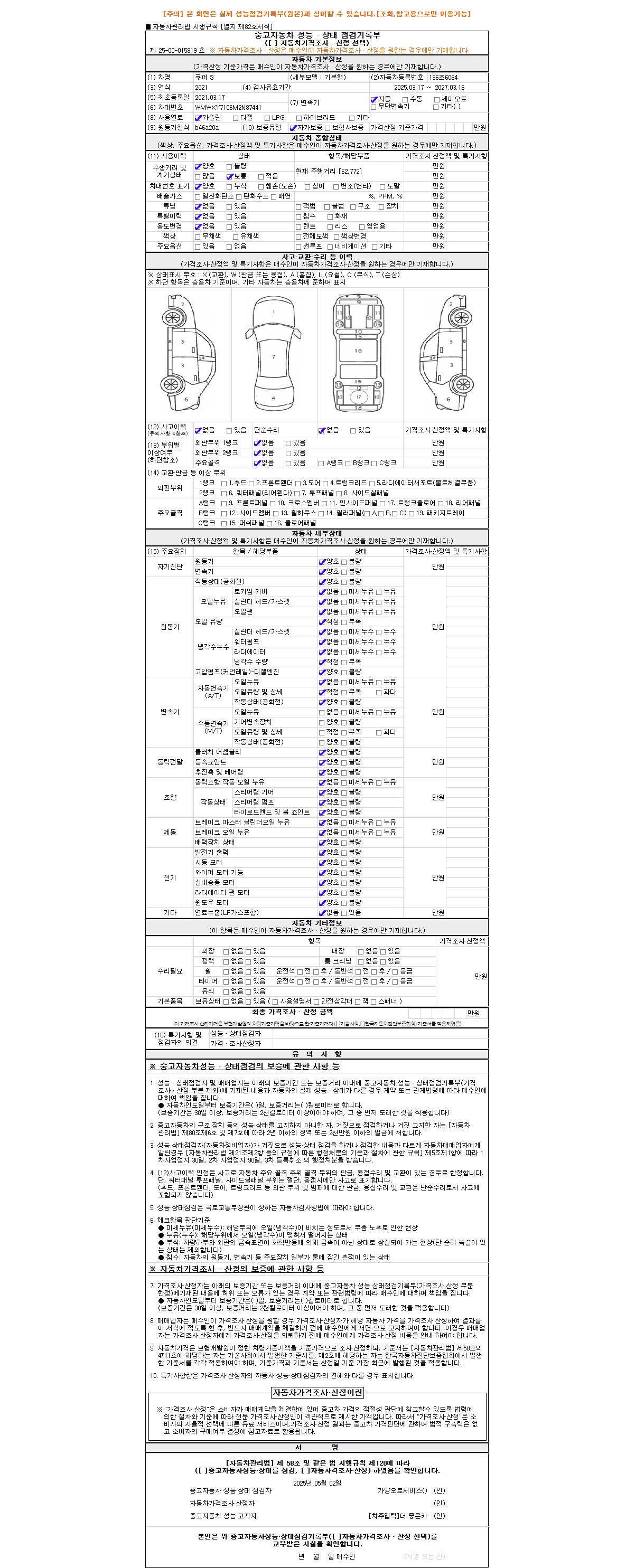자동차관리법 시행규칙 제120조의 규정에 따라 별지 제 82호서식 《중고자동차 성능, 상태점검 기록부》를 발행한 성능, 상태점검자 및 매매자는 아래의 보증기간 또는 보증거리 이내의 중고자동차, 성능점검 기록부에 기재된 내용과 자동차의 실제 성능, 상태가 다른 경우 계약 또는 관계법령에 따라 매수인에 대하여 책임을 집니다.