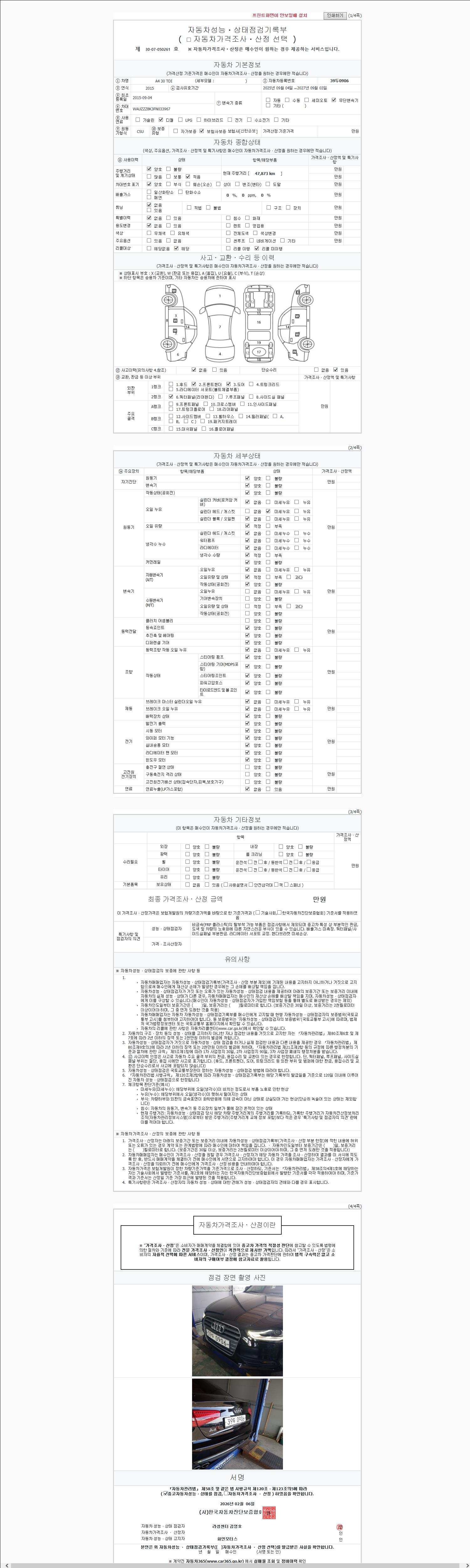 -중고자동차 매매업자를 통해 차량을 구입하실 경우 반드시 "중고자동차 성능, 상태점검 기록부"를 교뷰 받으셔야 하며, 매매업자는 반드시 의무 교부 하여야 압니다.