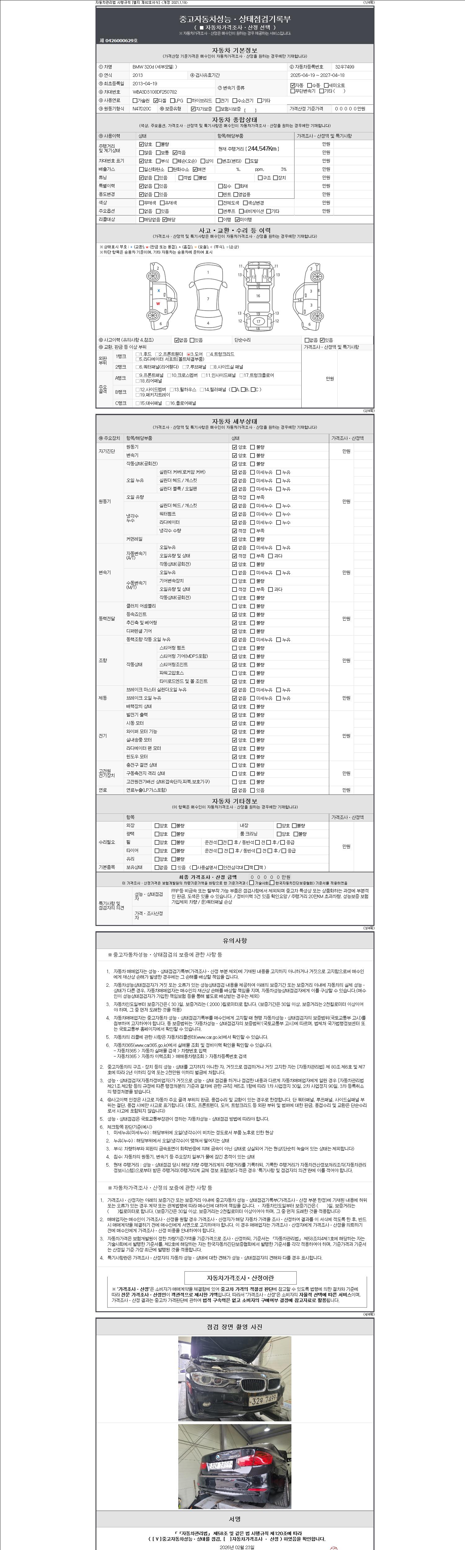 -중고자동차 매매업자를 통해 차량을 구입하실 경우 반드시 "중고자동차 성능, 상태점검 기록부"를 교뷰 받으셔야 하며, 매매업자는 반드시 의무 교부 하여야 압니다.