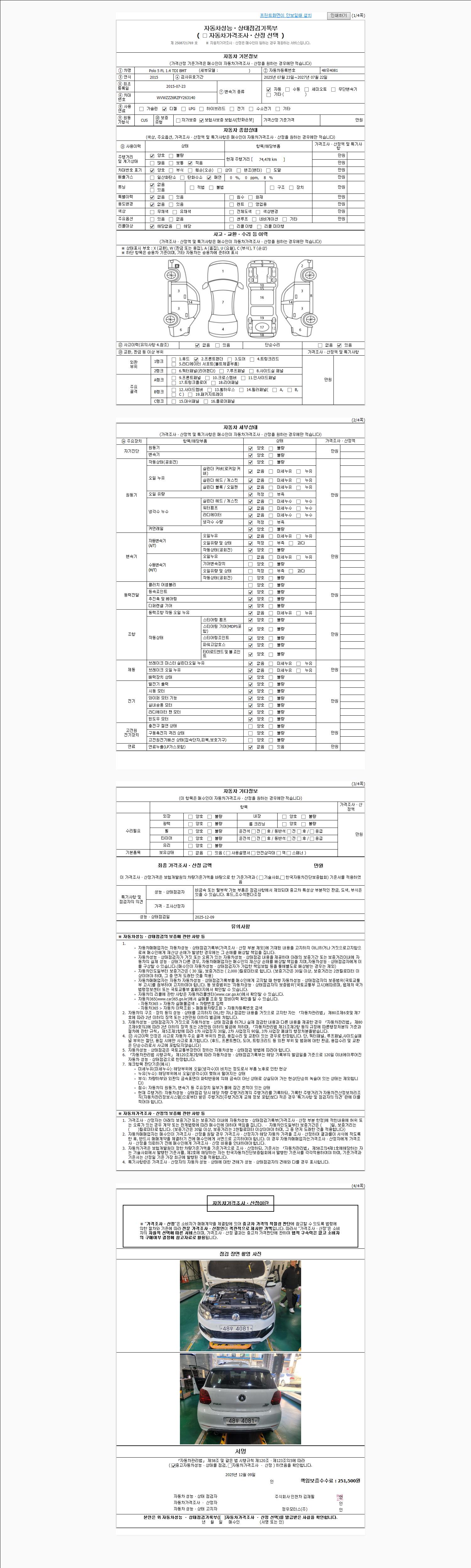 | 주행거리 | 74,478 km | 차량번호 | 48우4081 | 사고유무 | 성능기록부 참조 | 제시번호 | 제 2025068099 호 |