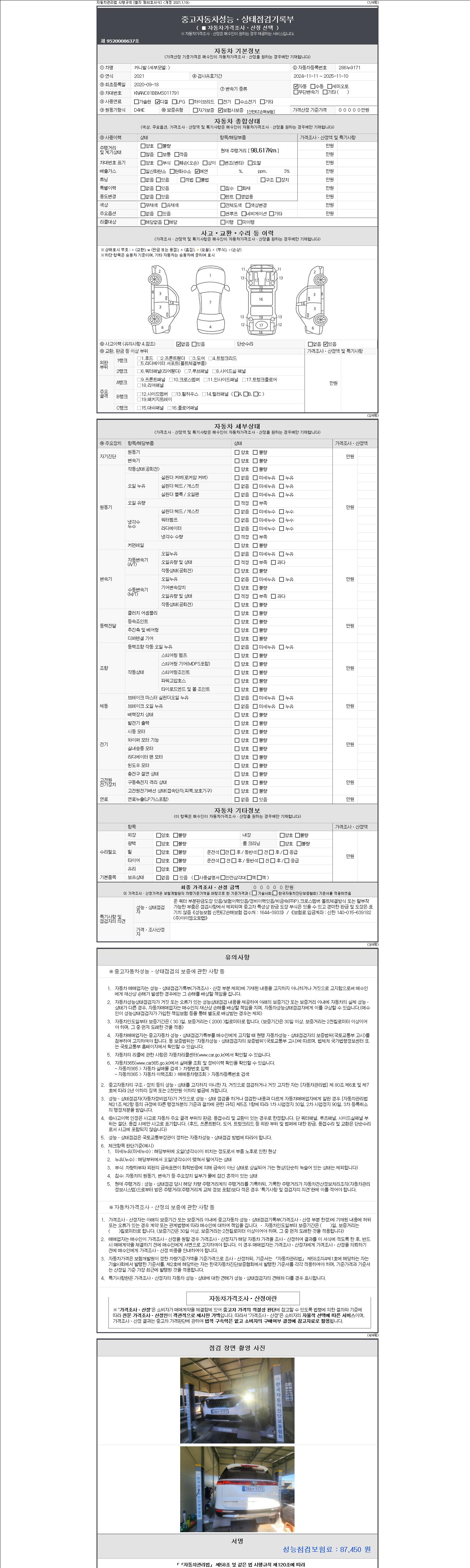 자동차관리법 시행규칙 제120조의 규정에 따라 별지 제 82호서식 《중고자동차 성능, 상태점검 기록부》를 발행한 성능, 상태점검자 및 매매자는 아래의 보증기간 또는 보증거리 이내의 중고자동차, 성능점검 기록부에 기재된 내용과 자동차의 실제 성능, 상태가 다른 경우 계약 또는 관계법령에 따라 매수인에 대하여 책임을 집니다.