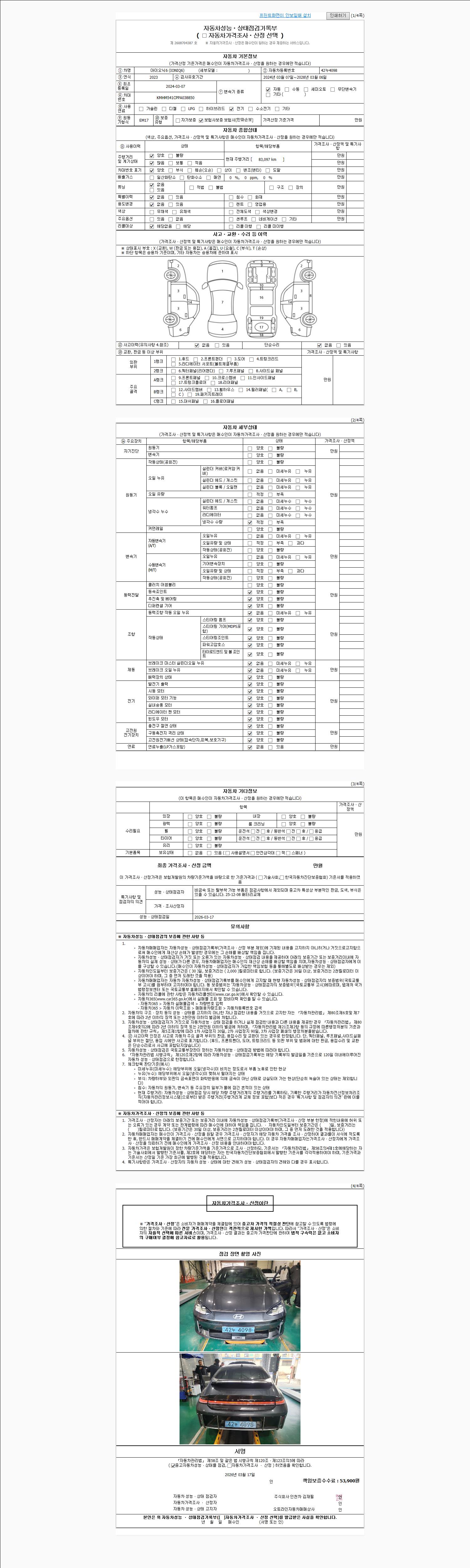 | 주행거리 | 83,097 km | 차량번호 | 42누4098 | 사고유무 | 성능기록부 참조 | 제시번호 | 제 2026013817 호 |